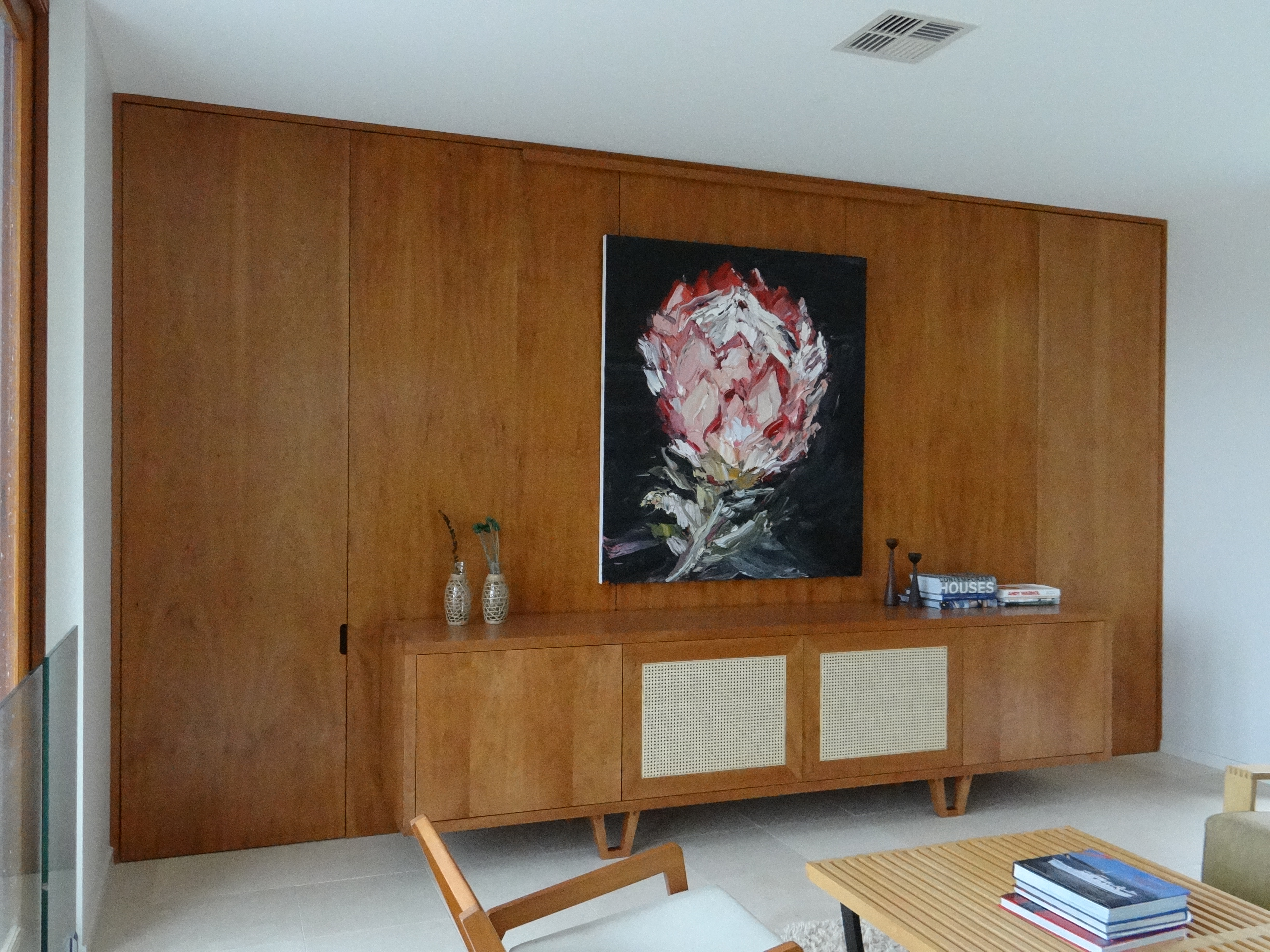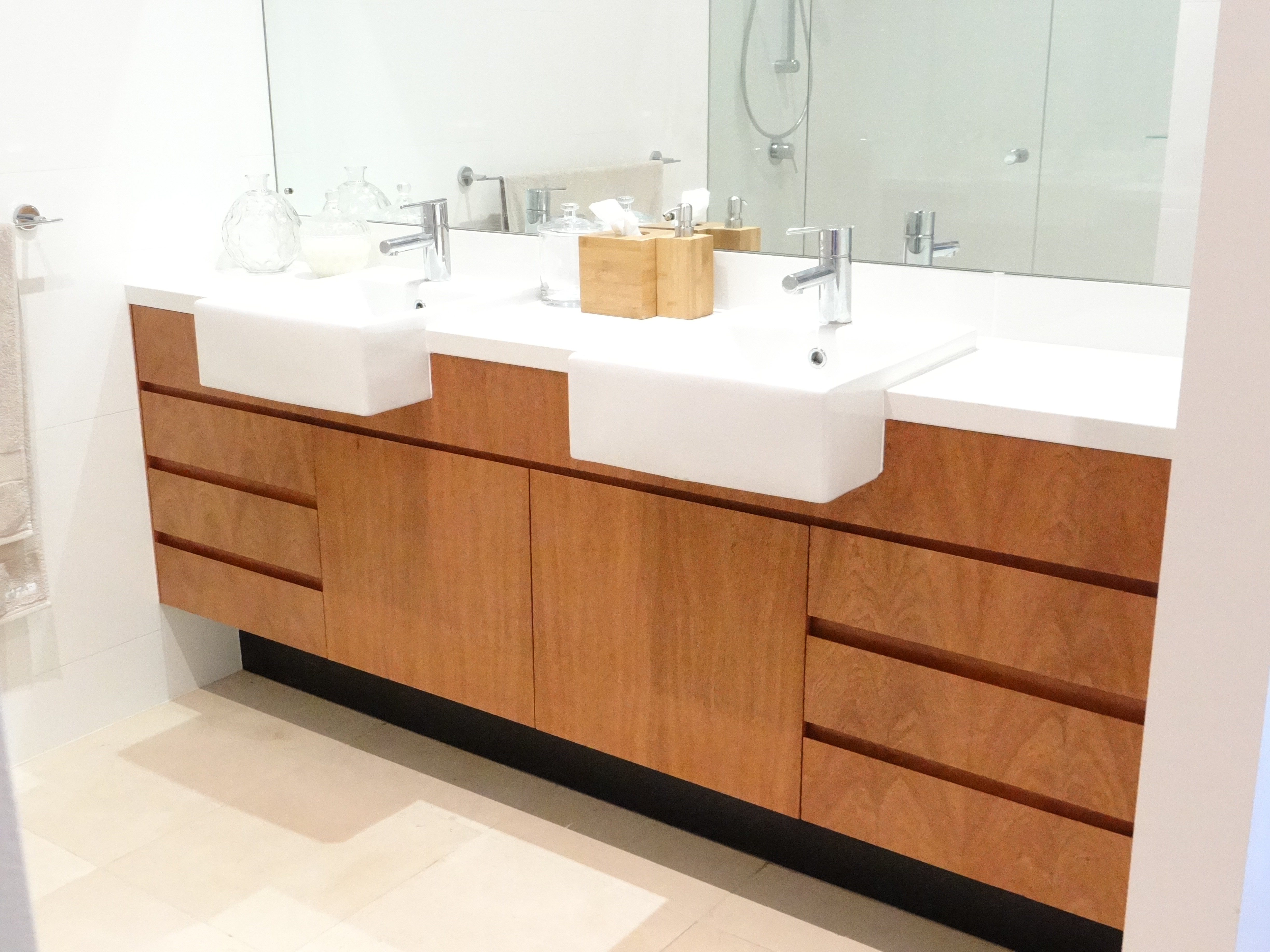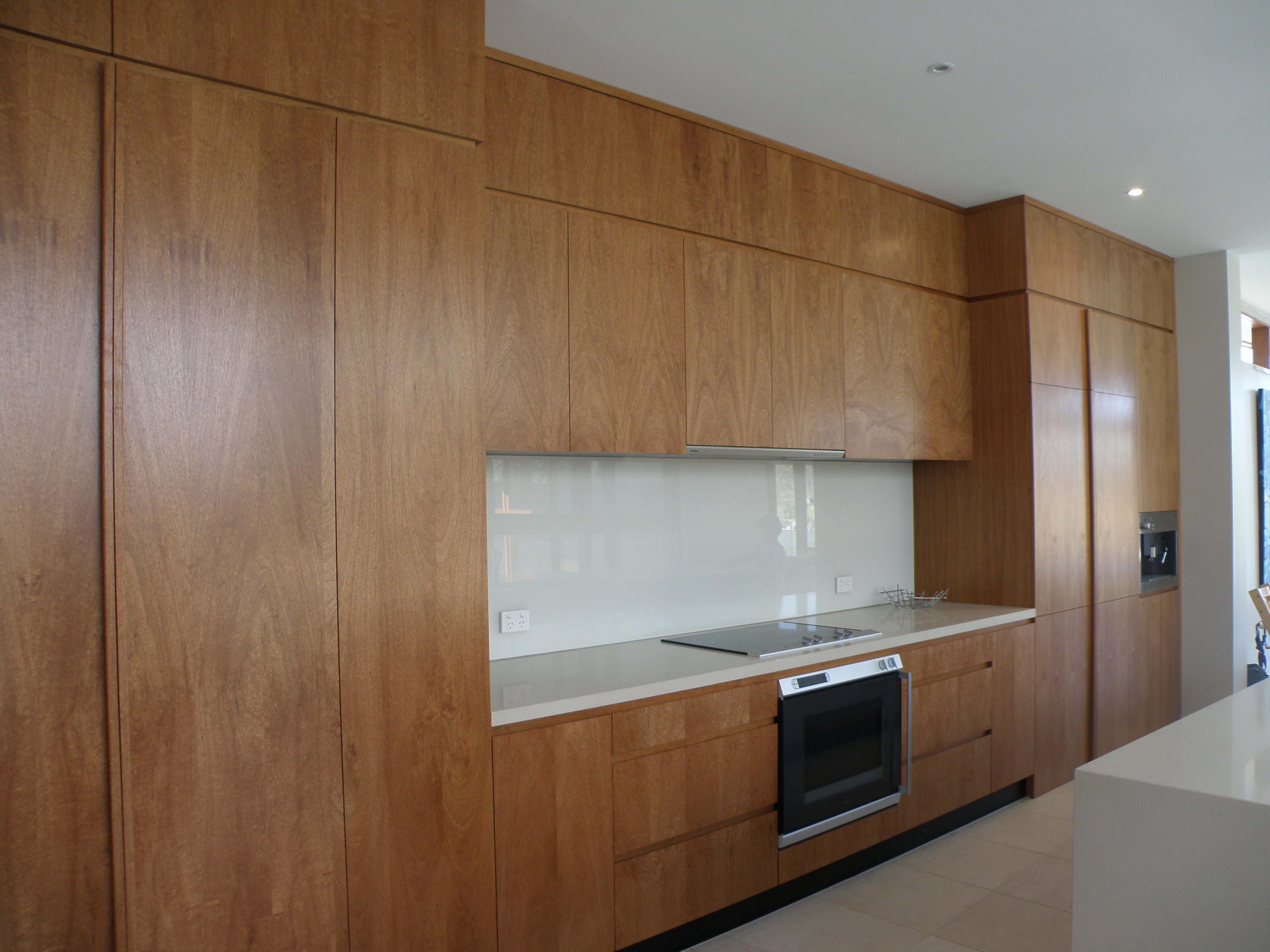 This project included production of Laminated Timber Bench Tops, high quality veneered doors (using veneer manufactured in house), veneered Wall Paneling incorporating hidden timber doors, and three Entertainment Units.